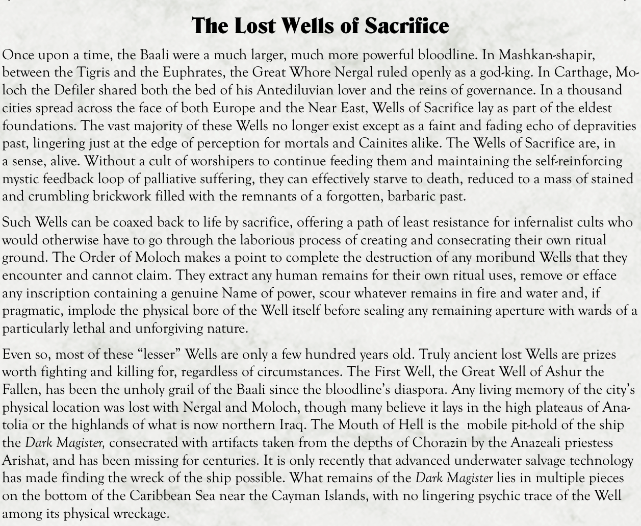 All while the Gangrel and the Revenant are unsure what the other is and what they are about because the Revenant is confused by why a random vampire called him trying to get information to a Sabbat Head Inquisitor (the gangrel's sire) and who he is while the Gangrel isn't sure if he is talking to a human, ghoul, or what until they both reveal what they are to each other, that it involves demons and agree to work together so long as Gangrel hands any dhabi revenants to him (with the players learning that deals with demons of various kinds can allow vampires to conceive children due to the players researching more on demons and the players wondering if some revenants are the result of eugenic breeding of dhampirs along with the ancient dhampirs that hunted vampires being because their vampiric parents were infernalists and the dhampirs may have presumed all vampires were)